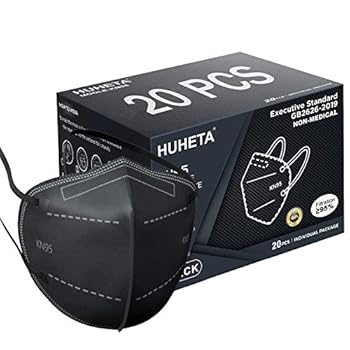 HUHETA KN95 Face Mask 20 Packs, 5 Layer Safety Mask with Elastic Ear Loop and Nose Bridge Clip, Filter Efficiency Over 95%, Protective Masks for Indoor and Outdoor Use (Black Mask)